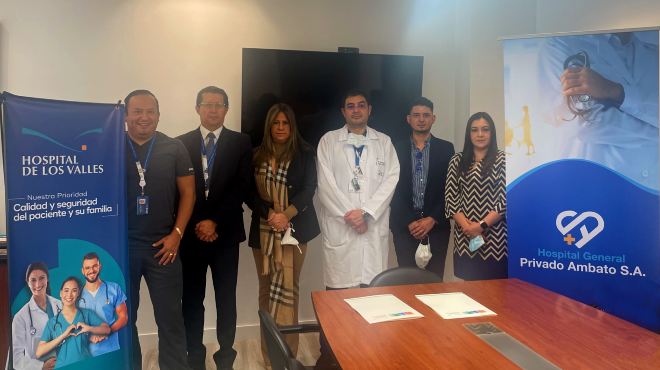 Cristhian Tapia, gerente de Facturación y Convenios del HDLV; Eduardo Gabela, gerente Comercial del HDLV; Diana Pinilla, gerente general del HDLV; Santiago Ruales, director médico del HDLV; Andrés Villena, gerente general del Hospital General Privado de Ambato; Paola Viteri, asesora del Hospital General Privado de Ambato. |