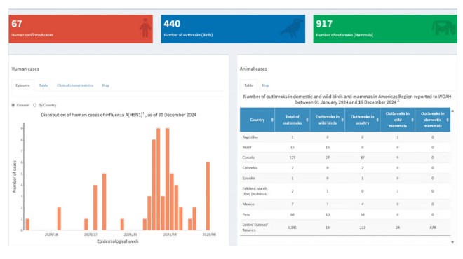 Entre el 1 de enero y el 31 de diciembre de 2024, la plataforma reportó 66 casos humanos confirmados en los Estados Unidos y 1 en Canadá, y más de 1.300 brotes en animales en varios países de la región. Hasta el momento no se ha identificado transmisión de persona a persona, ha agregado.
