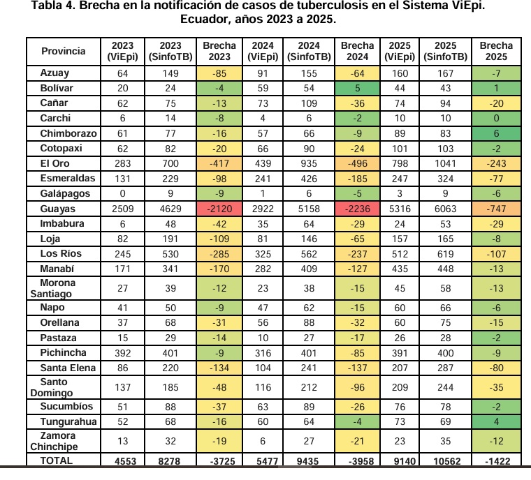 boletín de Transparencia de Datos de Tuberculosis (TB), correspondiente a 2023-2025 ha determinado brechas negativas entre los sistemas de notificación de la enfermedad SinfoTB y ViEpi, así como un incremento relevante de casos en la