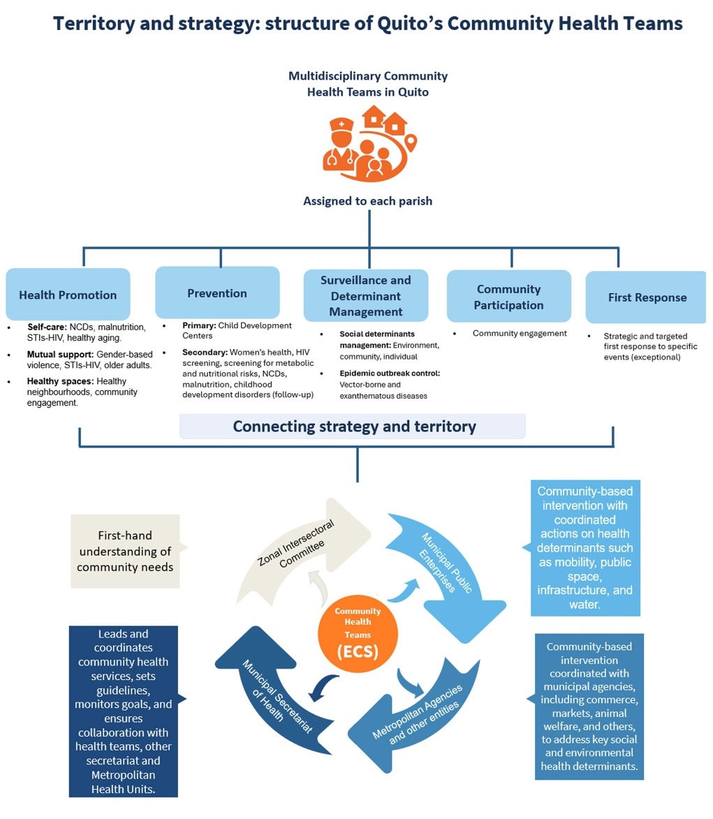 creación de Equipos de Salud Comunitaria (ESC) multidisciplinarios, desplegados en las 65 parroquias de la ciudad. Estos ya han sido institucionalizados y promueven la salud, previenen enfermedades y coordinan acciones con otros sectores municipales y comunitarios.